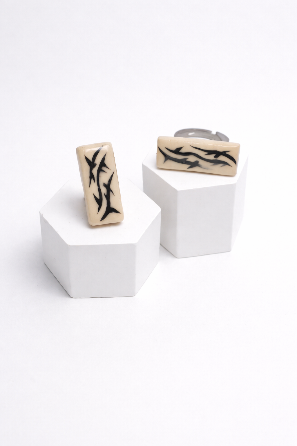 Anillo Tribal elaborado en cerámica con diseño artesanal y estética contemporánea. Presenta una pieza central rectangular en tono marfil con ilustración gráfica en negro de líneas orgánicas y dinámicas que evocan un estilo tribal moderno.