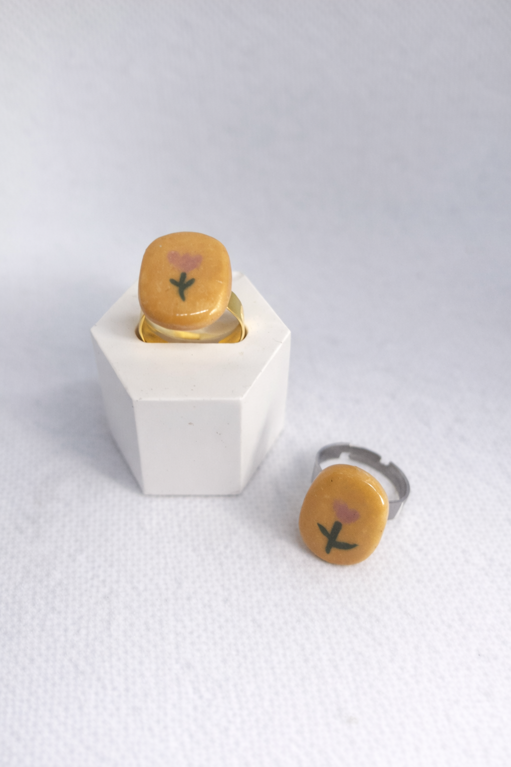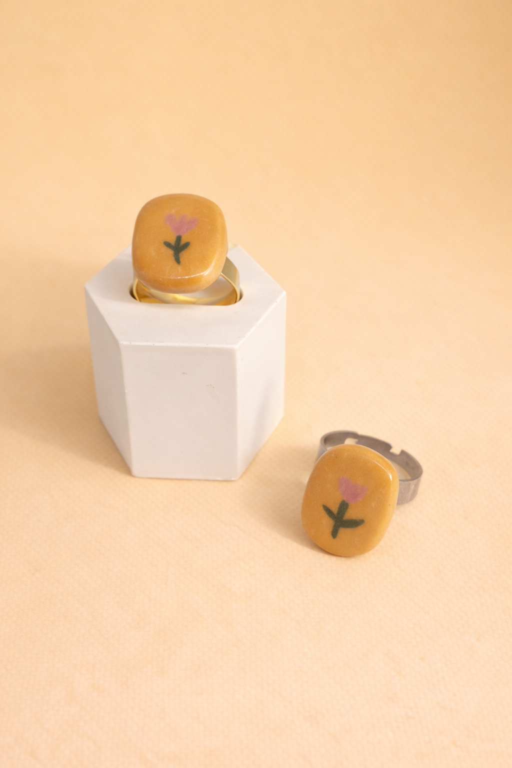 Anillo Tulipán elaborado en cerámica con diseño artesanal y acabado esmaltado. Presenta una pieza central de forma cuadrada en tono mostaza cálido, decorada con una delicada flor rosa estilizada tipo tulipán y tallo verde, creando una combinación suave y armoniosa.